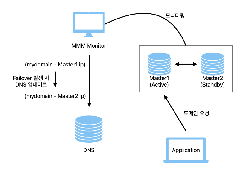 아래의 구성도를 보면 DB에 대한 요청을 도메인으로 진행하고, MMM 모니터 서버는 Failover가 발생하면 DNS를 갱신하여 도메인에 Standby Master의 ip를 연결합니다.