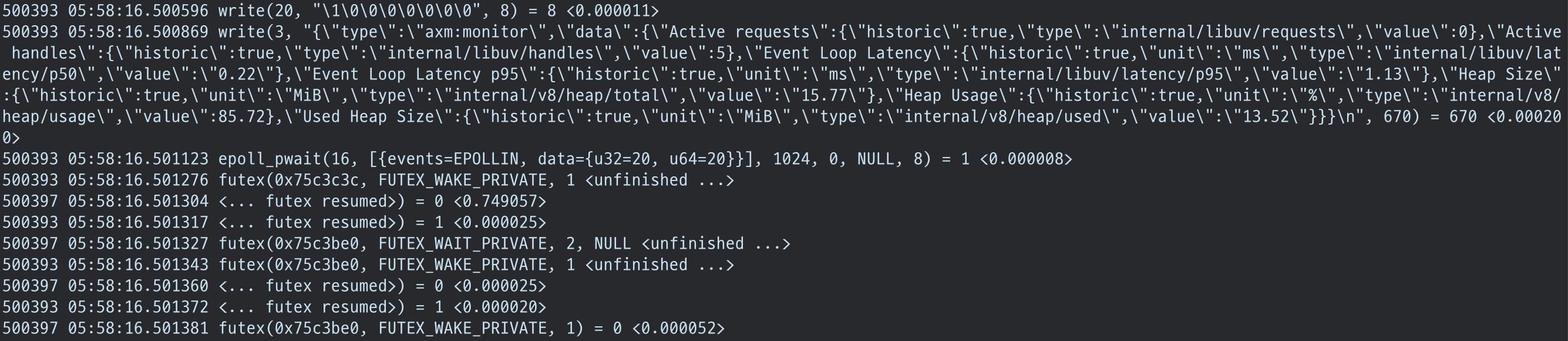 페이로드를 간단하게 보면 type : axm:monitor라고 적혀 있는데, next.js는 PM2 위에서 동작하고 있고, axm은 PM2의 모니터링을 위한 내부 모듈이다. 모니터링을 위해 주기적으로 서버 상태 메트릭을 로그로 수집하고 있기 때문에 strace에서 확인이 된다.